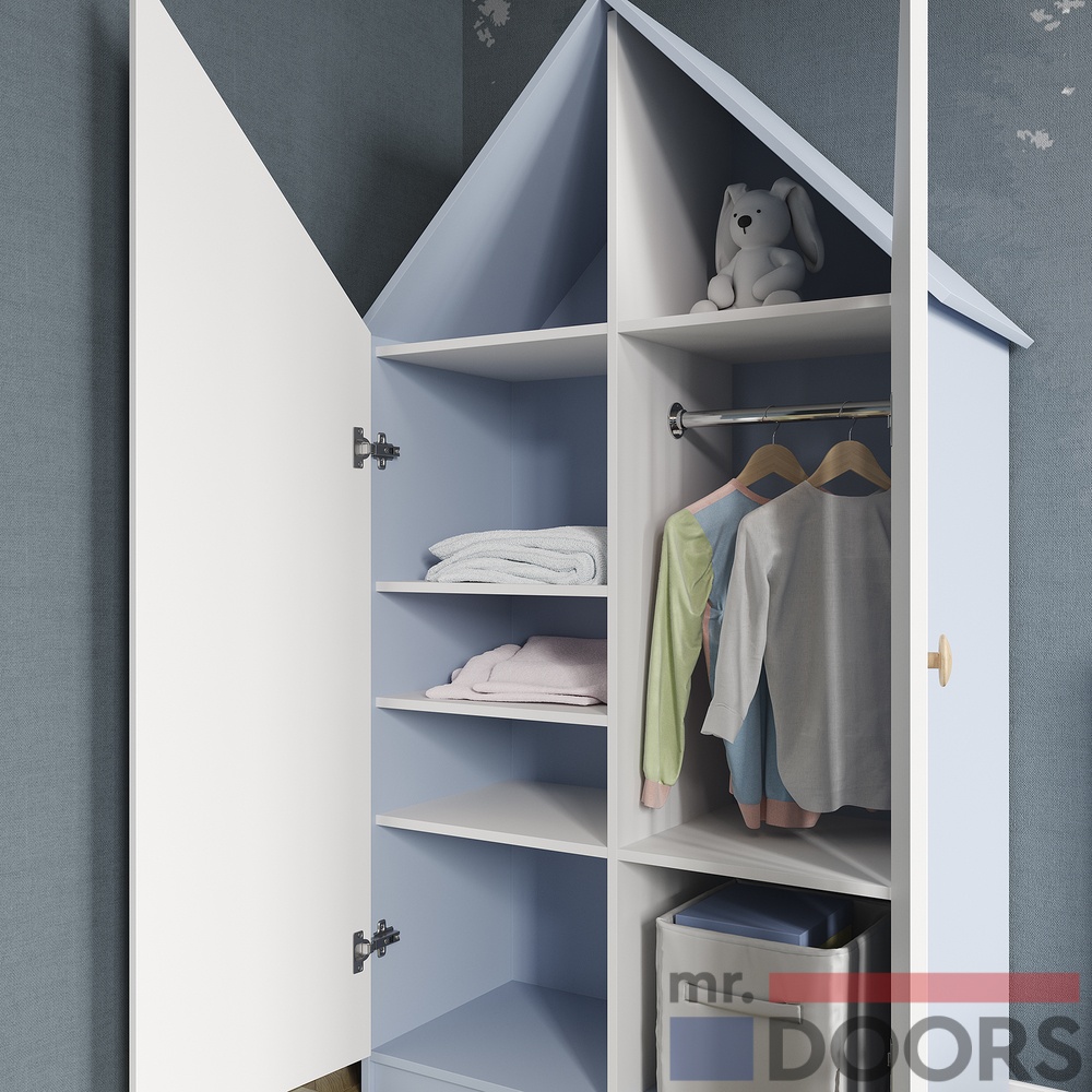 В шкафу найдутся место и для полок разной высоты, и для платяной штанги: поместятся все вещи и обувь. Столик объединён с небольшой системой хранения, где можно расставить карандаши, раскраски и другую мелочь.