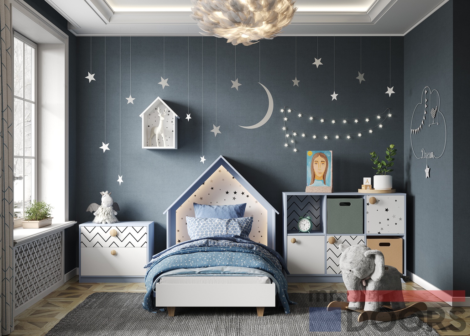 Корпусные элементы выполнены из ламинированной плиты в декорах «Селеста», «Алебастр» и «Муссон», фасады — из ЛДСП в декоре «Алебастр». Мебель может быть украшена принтами «Звездочки» и «Волны».