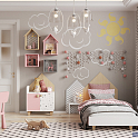 Стены комнаты и элементы мебели украшены принтами «Звёздочки», «Волны» и «Треугольники». Вся мебель эргономичной формы, с круглыми ручками, за которые удобно браться и о которые невозможно сильно удариться. Система хранения с продуманным наполнением вмещает в себя игрушки и книжки. Высота кровати и туалетного столика, как и габариты композиции, рассчитываются индивидуально при оформлении заказа.