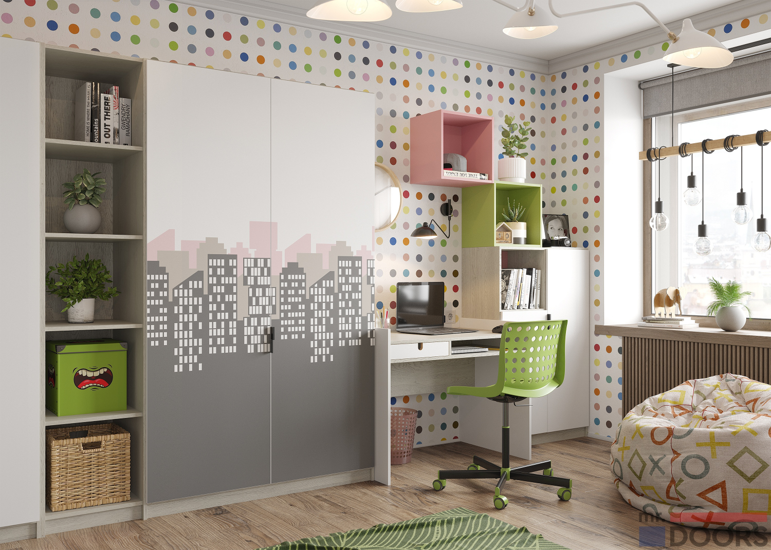 Корпусные элементы выполнены из ламинированной плиты в декорах «Дуб Гладстон белый», «Алебастр» и «Фламинго». Фасадные сделаны из ламинированной плиты в декоре «Алебастр». Нежное сочетание цветов дополнено интересными принтами «Город» и «Хаос».