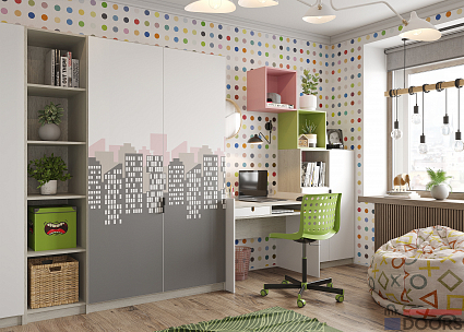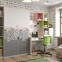 К кровати примыкает стеллаж с выделенным рабочим местом, где можно делать уроки, второе рабочее место находится в противоположной части комнаты, рядом с платяным шкафом и другой стеллажной системой. Места для хранения хватит всем. Комбинация открытых секций и закрытых боксов, а также выдвижных ящиков позволит разместить на виду всё, что может понадобиться. Наполнение платяного шкафа выбирается при разработке проекта.