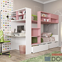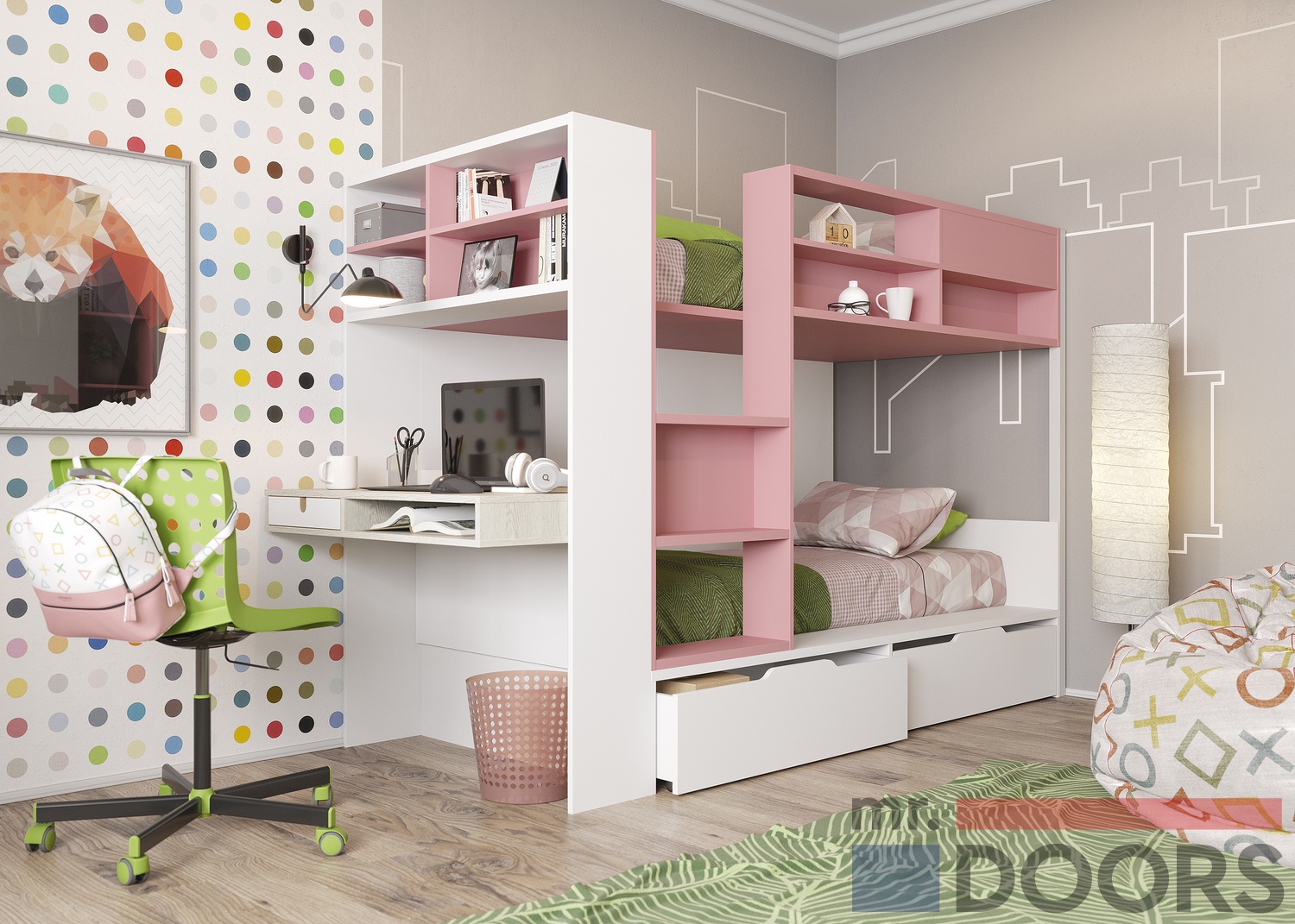 Детская комната для двух девочек-школьниц с удобной и безопасной двухъярусной кроватью. Кровать оборудована комфортной лестницей и высокими бортиками, которые одновременно можно использовать как полки. В нижней части расположены выдвижные ящики с аккуратными гладкими фасадами и интегрированными ручками: дети не запнутся и не поцарапаются о них.