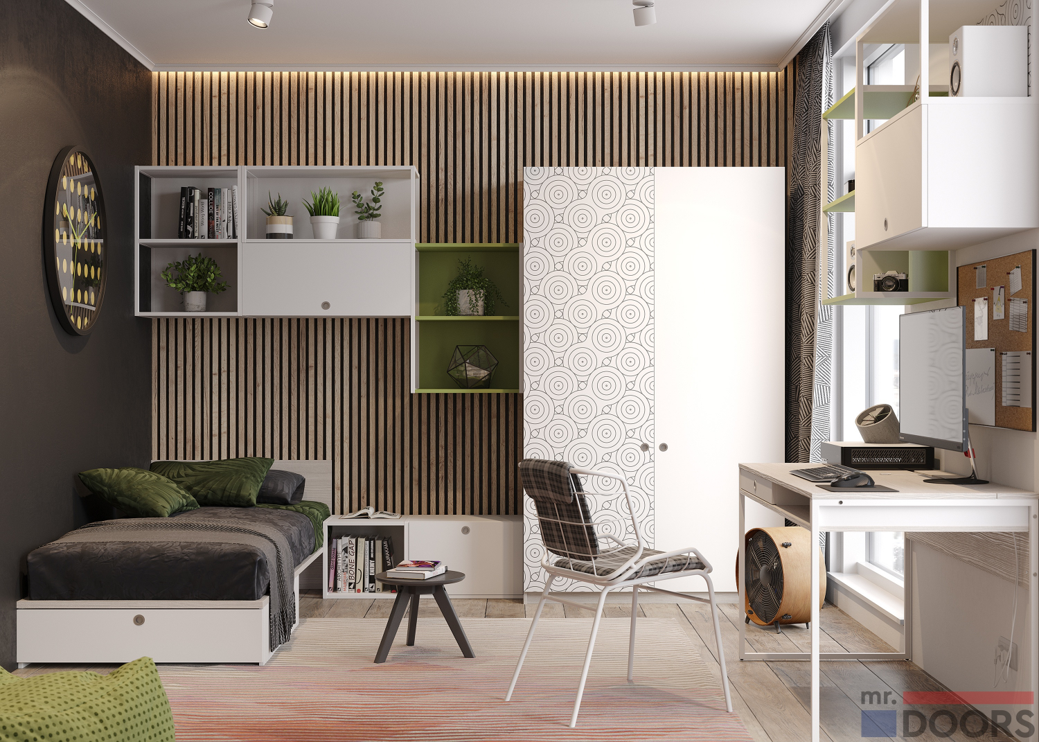 Подростковый возраст полон эмоций, впечатлений и переживаний. Для ребенка в это время особенно важно иметь место, где он будет чувствовать себя спокойно и в полной безопасности. Именно поэтому для данной композиции мы выбрали спокойные светлые оттенки, которые ненавязчиво разбавили яркими акцентами.