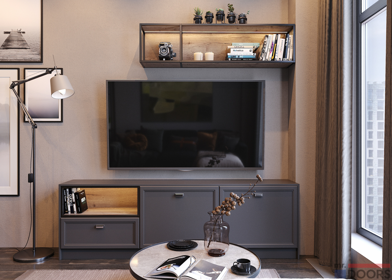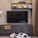 Небольшая композиция для гостиной комнаты для зоны телевизора. Состоит из напольной тумбы и подвесной полки. Открытая секция и полка оборудована приятной теплой подсветкой. Элементы композиции имеют приятный для глаза декор. Ненавязчивый и одновременно с этим стильный. Эта мебель подойдет для небольшой гостиной комнаты или для совмещенного помещения, например, с кухней.