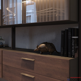 Полки и фасады – TSS плита в декоре «Династия Коньяк», которые достоверно имитируют поверхность древесины - наличие глубоких пор, естественного спила, ручной обработки.  Даже на ощупь TSS-плиты сложно отличить от натурального дерева.