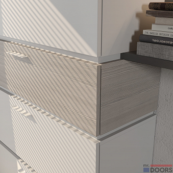Основной материал композиции — ламинированная плита в декоре «Алебастр», «Сосна» и «Муссон». Из неё сделан и корпус, и фасады. Ручки Slate белого цвета эргономичной формы облегчают открывание боксов.