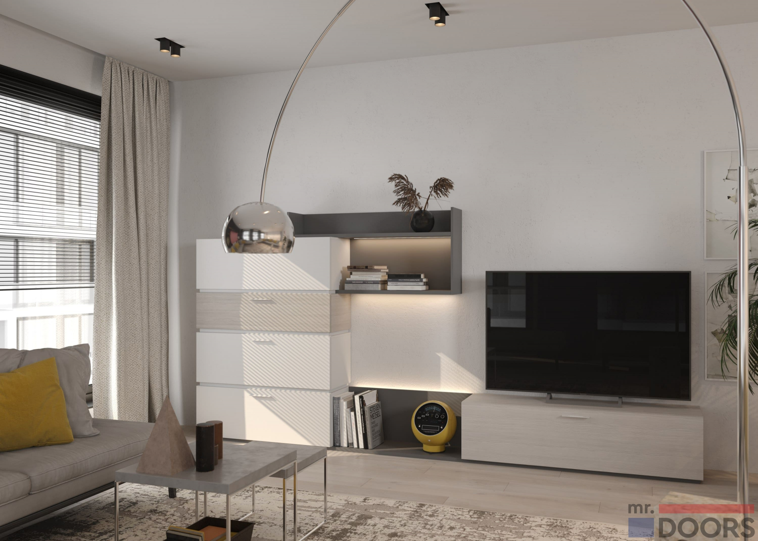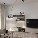 Гостиная в светло-серых тонах выполнена в соответствии с принципами минимализма. Мебельная композиция состоит из нескольких боксов для хранения, ТВ-юнита, а также открытой полки. LED-подсветка в тёплых тонах подчёркивает дизайнерские решения и делает мебель более изящной визуально.