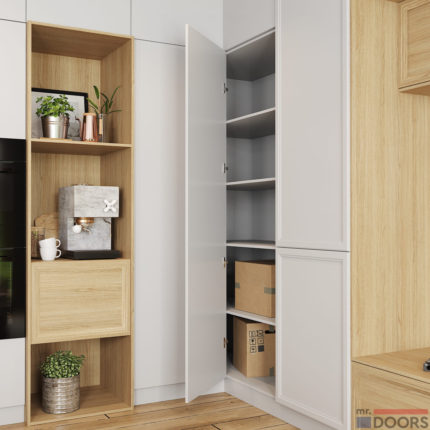 В построении композиции применена разная типология фасадов: левый закрытый стеллаж - рамочный фасад «Урбан» из МДФ в матовой эмали;