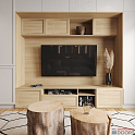 Гостиная в загородном дома с гладкими матовыми фасадами бежевого цвета. Центральная часть (тв-юнит) декорирована под натуральный дуб. Эта светлая стенка для гостиной с зоной для тв и закрытым стеллажом отлично впишется в интерьер коттеджа.