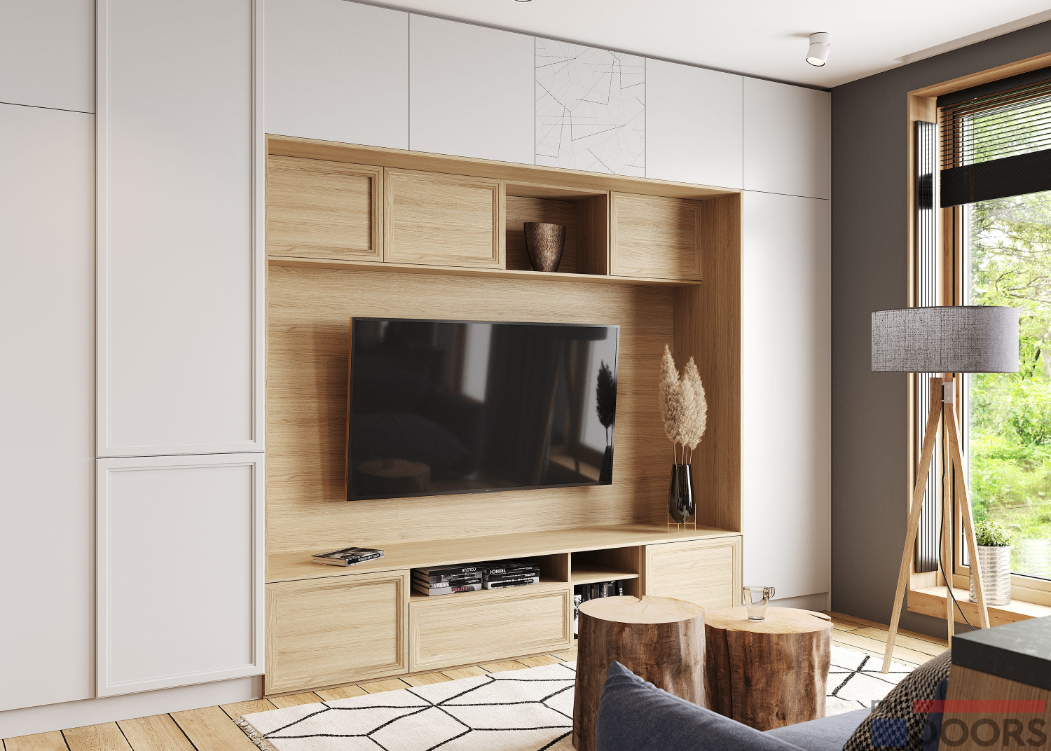 Если вам нравится отделка под натуральное дерево и светлые цвета оформления стоит присмотреться к этому проекту. Гостиная отлично будет смотреться в светлой комнате с окнами во всю стену.