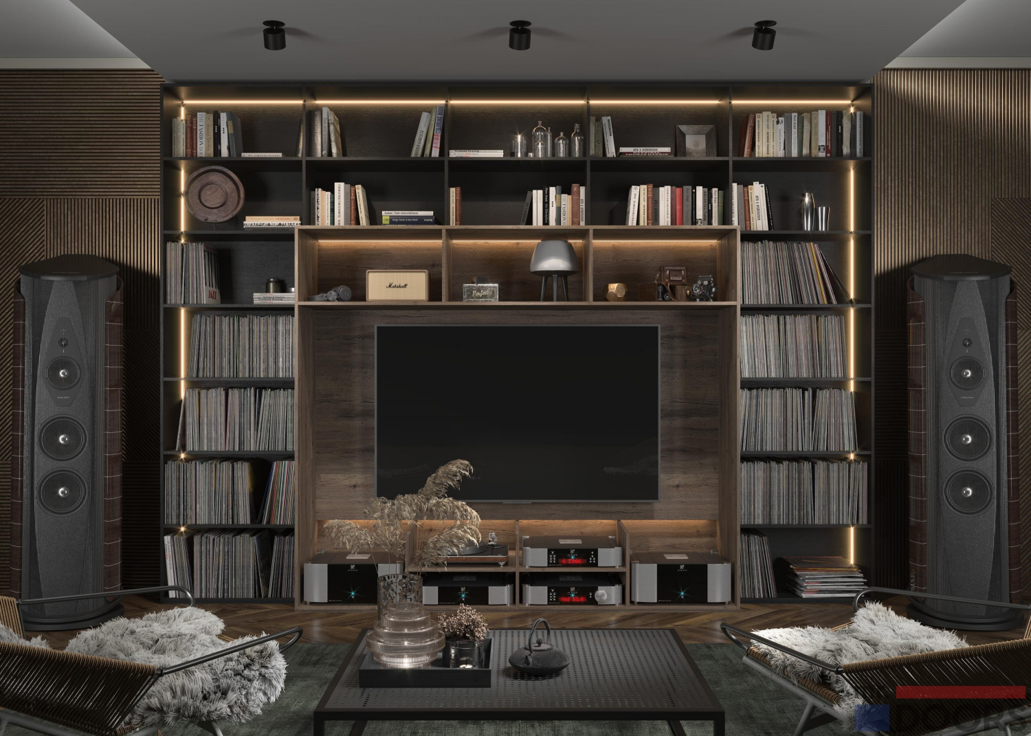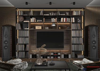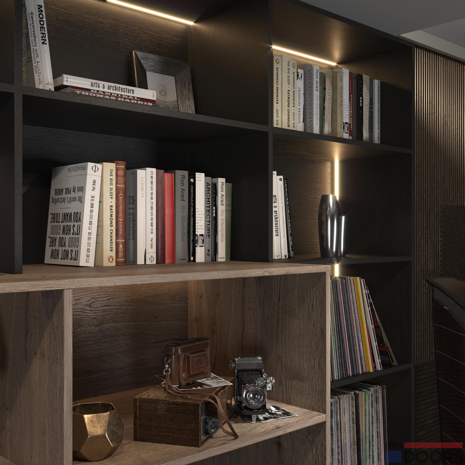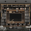 Врезная LED-подсветка выделяет часть открытых секций, делая комнату более уютной. Система хранения, объединённая с ТВ-юнитом, обладает внушительными габаритами. Чтобы она удачно смотрелась именно в вашей квартире, мы изготавливаем мебель на заказ по индивидуальным размерам. Проект разрабатывают дизайнеры Mr.Doors, учитывая всё пожелания клиента.