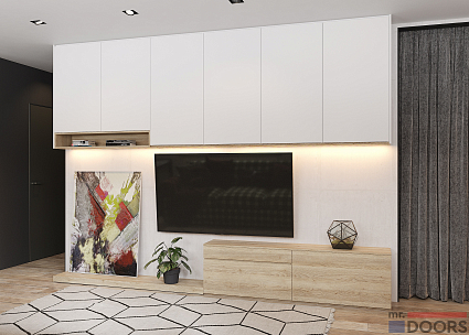 Корпусные и фасадные элементы выполнены из ламинированной плиты в декорах «Алебастр» и «Дуб Гладстоун» программы FEELWOOD (текстура и структура материала идеально имитирует поверхность натурального дерева).