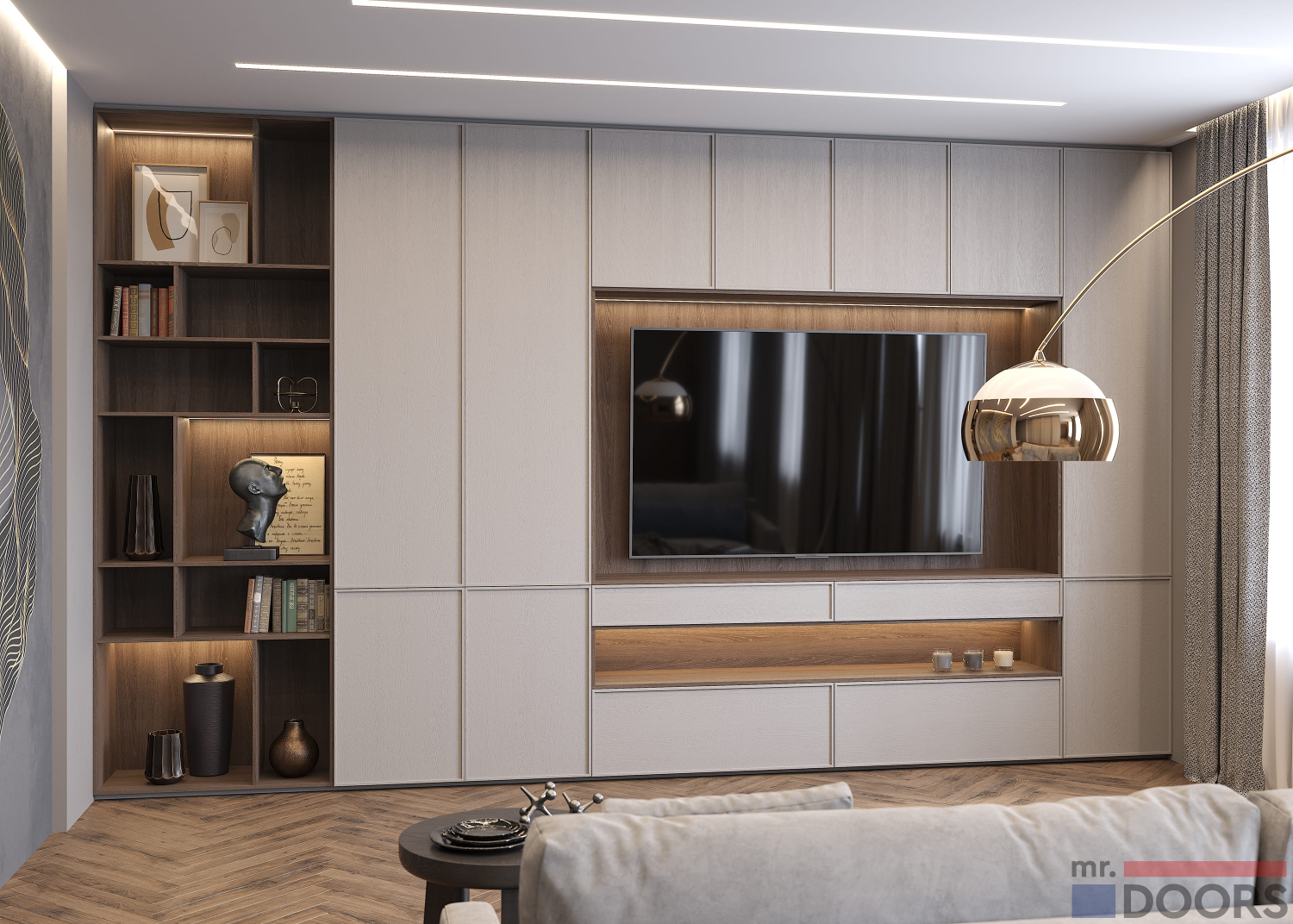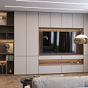 Универсальная система хранения для гостиной с комбинацией открытых и закрытых модулей, а также ТВ-юнитом, прекрасно подойдёт для интерьера, оформленного в любом стиле.