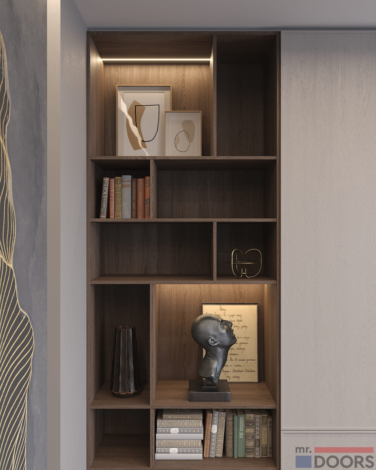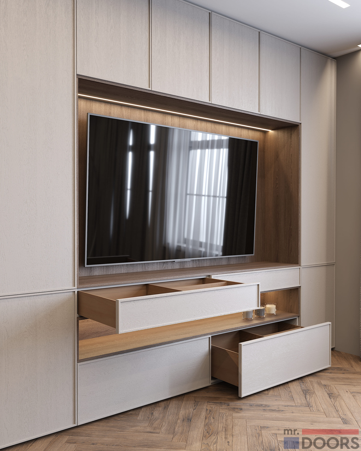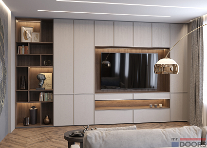 Рамочные фасады «Трей» созданы из МДФ в плёнке «Кашемир Эковуд». Матовая поверхность абсолютно гладкая и лишена ручек — створки открываются по нажатию. Благодаря изготовлению на заказ по индивидуальным размерам и сдержанному дизайну, система хранения во всю стену не кажется громоздкой — напротив, визуально конструкция лёгкая и изящная. Но вместительная.