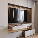Корпус выполнен из ламинированной плиты в декоре «Кашемир», открытые модули — в декоре под дерево «Дуб Орлеанский коричневый», они воспроизводят текстуру поверхности натурального дерева весьма точно. Изящества открытым блокам добавляет встроенная LED-подсветка в тёплых тонах. Также она есть в сегменте, предназначенном для размещения телевизора.