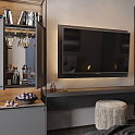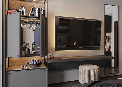 ТВ-зона для гостиной. Состоит из трех элементов, справа налево: система хранения с баром, подвесная консольная столешница, высокое подвесное зеркало. Самым интересным модулем в данной композиции является первый. Стильная система, включающая в себя нижний закрытый дверцей ящик, открытые полки и, самое главное, компактный бар с зеркальной задней стенкой. Там можно разместить любимые напитки и бокалы. Телевизор располагается над консольной столешницей.