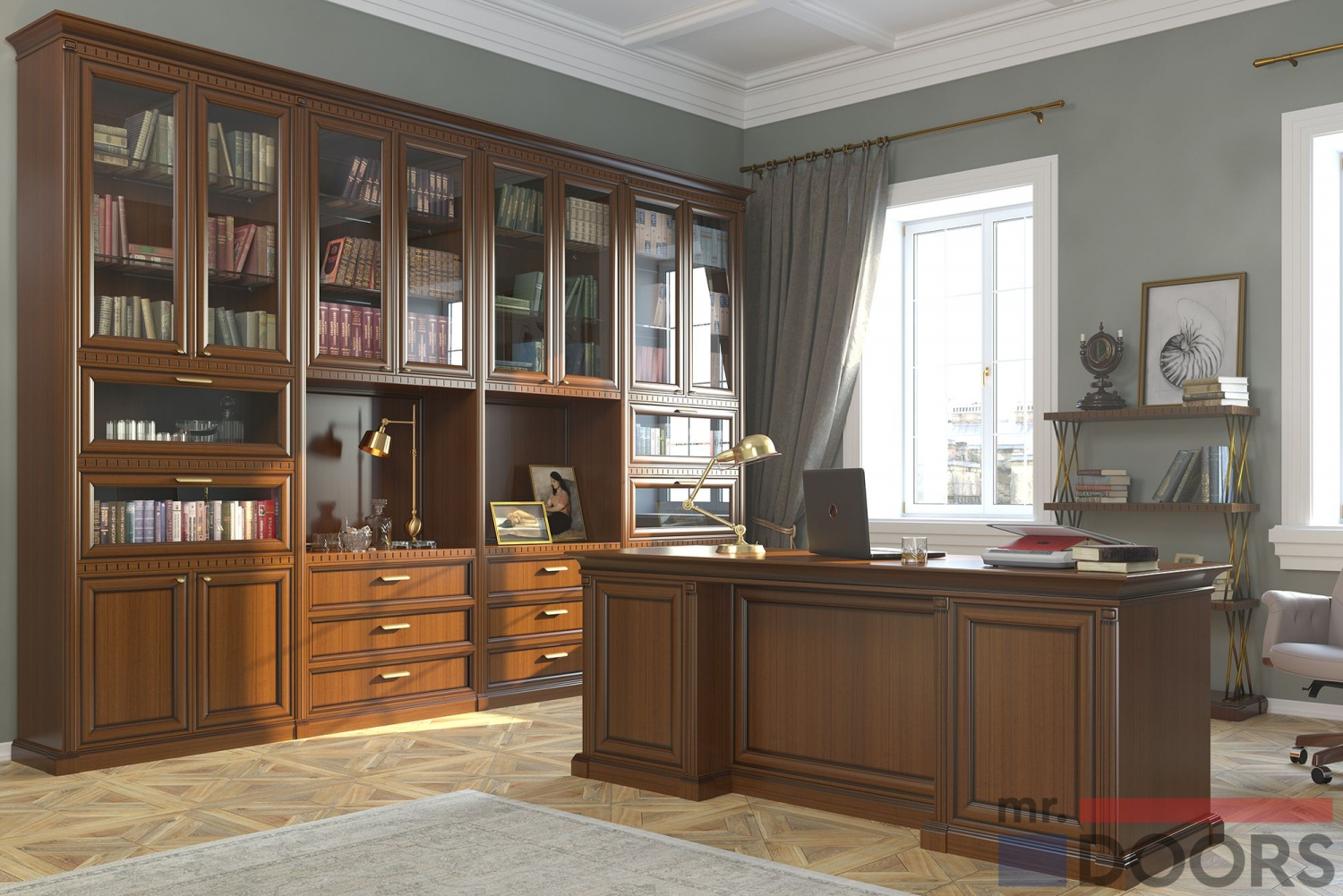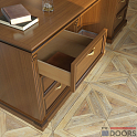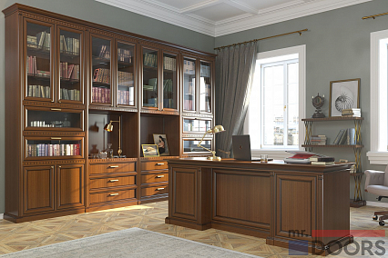В состав кабинеты входят письменный стол, открытый стеллаж и библиотека. Они выполнены в декоре «Орех благородный». Каркас изготовлен из панелей «Тамбурато», это легкий, но очень прочный высококачественный материал, устойчивый к перепадам влажности и температуры.