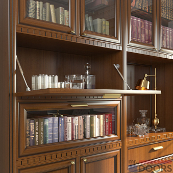 Фасады и передние стенки ящиков изготовлены из МДФ в отделке шпоном натурального дерева, со вставками из прозрачного стекла и шпонированных листов МДФ. Открытый стеллаж украшен декоративными опорами в декоре «Античная бронза». Фурнитура кабинета — ручки «Барра», петли и лифты — выдержана в том же тоне. Декоративные цоколь и карниз изготовлены из древесного массива. Вертикальные панели украшены рельефным торцевым профилем и «розетками».