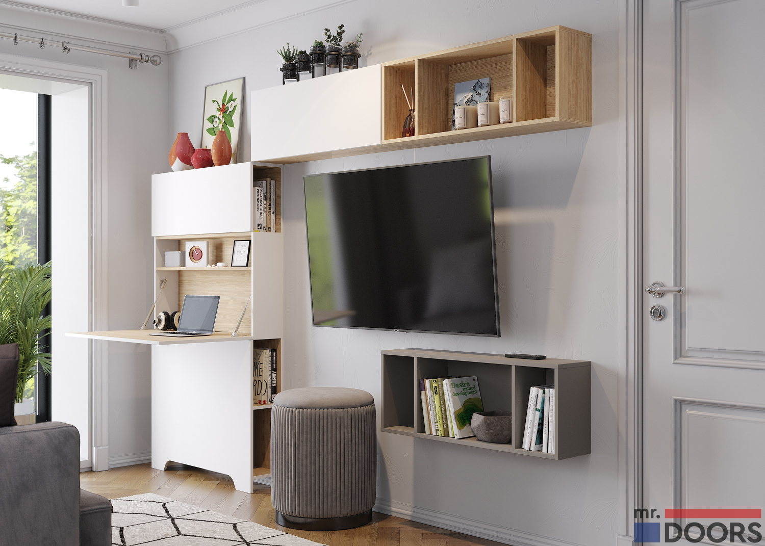 Рабочее пространство также оснащено подвесными полками. Это решение будет идеальным для людей, которые работают время от времени и при этом стеснены в площади. Разместить такой стеллаж можно в любом помещении квартиры.