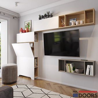 Корпусные и фасадные элементы выполнены из ламинированной плиты в декорах “Алебастр” и “Дуб Винченца”.