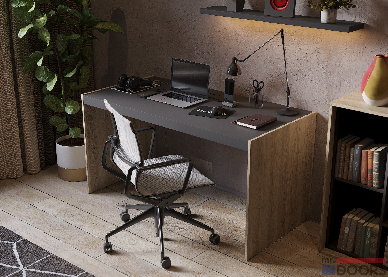 Иногда для работы нужен только качественный и удобный стол, на котором установлен ноутбук. Не нужны многочисленный ящики и тумбы, а немногочисленные вещи и книги легко убираются на компактной подвесной полке и в открытом стеллаже. В этом случае данный проект идеально вам подойдет. Лаконичный и стильный, он не занимает много места, при этом выглядит стильно, образуя единую композицию. Работать будет удобно, без сомнения!