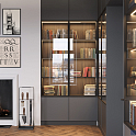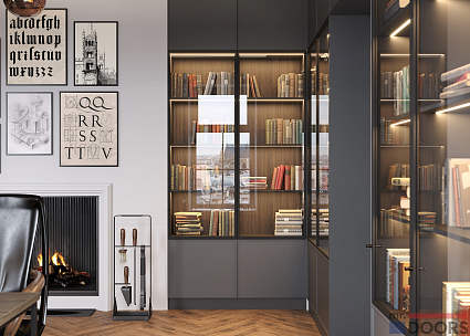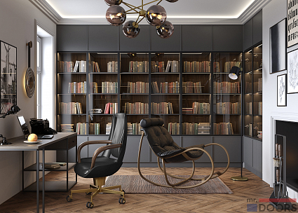 Кабинет-библиотека выполнен в современном стиле. Мебель одновременно красива и практична, встроенный шкаф идеально подходит для книг и документов. Витринные фасады «Джамп 20» остеклены декоративным стеклом «Гавана». Затемнённое, оно защищает бумагу от действия прямых солнечных лучей, а значит, продлевает жизнь собраниям сочинений любимых писателей. Часть фасадов не стеклянные, а глухие, из МДФ в плёнке «Урбан Графит». Асфальтовый оттенок смотрится стильно, вместе с тем, он универсален: подойдёт для помещения, оформленного в любой цветовой гамме. Корпус выполнен из ламинированной плиты в декоре «Ситивуд Чёрный», задние стенки и столешница рабочего стола декорированы в варианте «Орех Карини». Материал достойно имитирует натуральное дерево.