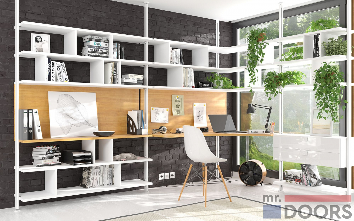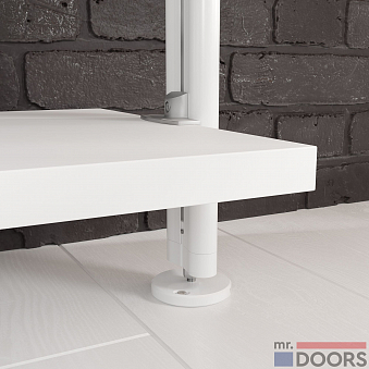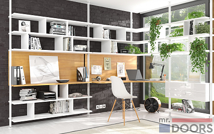 Основа кабинета — прочные алюминиевые стойки «Лофт» в белом цвете, которые крепятся к полу и потолку. Открытые полки и каркас подвесного модуля сделаны из ламинированных плит в декоре «Белый премиум». Рабочая поверхность и стеновые панели оформлены в декоре «Ольха». Сочетание красивое, изящное, настраивающее на рабочий лад. В столешнице предусмотрены специальные розетки для проводов.