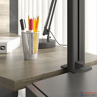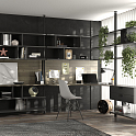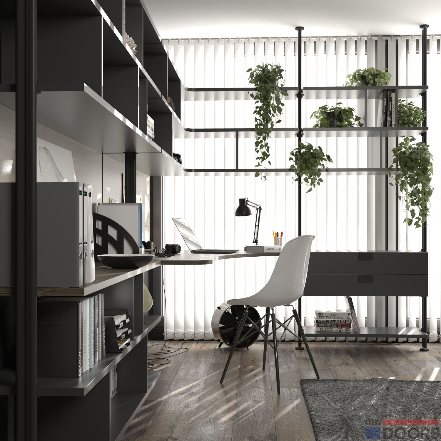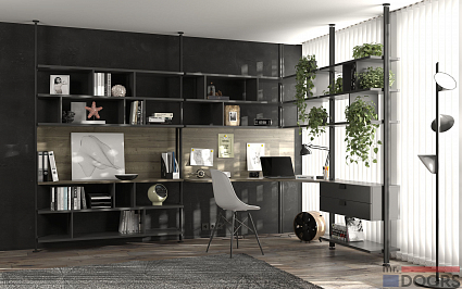 Кабинет открытого типа идеально подойдёт для квартиры с дизайном в любом из современных стилей, в том числе, минимализм или лофт. Основой для мебельной композиции служат прочные алюминиевые стойки с гальваническим покрытием. Они крепятся к полу и потолку, так что кабинет можно разместить в любой части помещения — в том числе, выполнить при его помощи зонирование большого пространства.