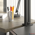 Рабочее место дополнено просторной столешницей, которая также крепится к алюминиевым стойкам. Полки различной ширины и высоты позволяют разместить в кабинете документы, книги и всё необходимое. Размеры индивидуальны, все элементы дизайнеры делают максимально подходящими для квартиры заказчика.