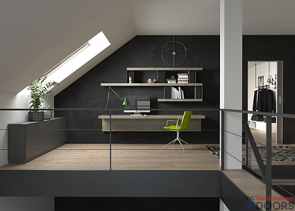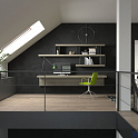 Композиция мебели для кабинета в темных тонах. Включает в себя необычный стол без опор, которой смонтирован на стене и интересную открытую подвесную полку. Особенности конструкции создают ощущение невесомости мебели, при этом все элементы очень удобны в использовании, ими можно полноценно пользоваться для работы. Стол с легкостью выдержит современный компьютер.