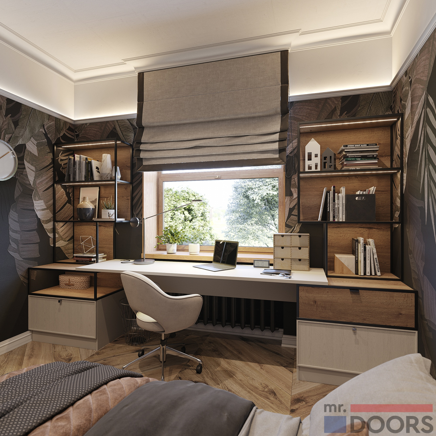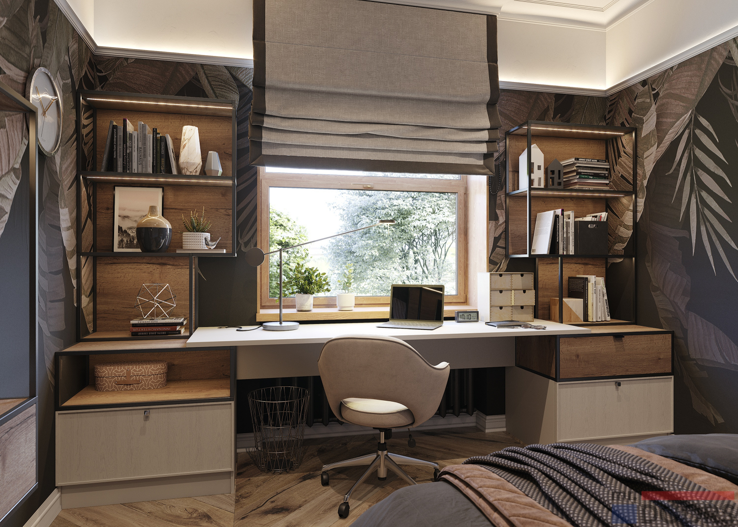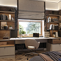 Проект кабинета, расположенный в спальне нравится очень многим. Он выполнен от стены до стены так, что письменный стол располагается прямо у окна. Столешница опирается на два симметричных стеллажа с ящиками и полками. Решение получается функциональным и очень стильным. Широкая столешница и вместительное решение для хранения документов сделает рабочий процесс удобным и комфортным. Композицию дополняет оформленный в том же стиле ТВ-Юнит, расположенный напротив кровати.