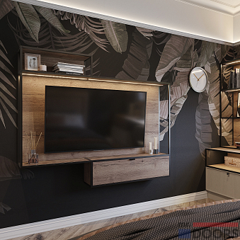 Симметричные стеллажи и ТВ-юнит сконструированы с помощью алюминиевых стоек системы “Кадро” чёрного цвета.