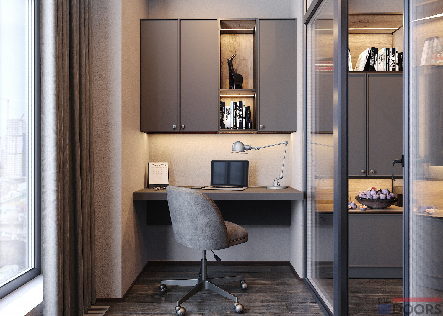 В настоящее время легко можно представить, что дома требуется два полноценных рабочих места. А при этом отдельного помещения для кабинета нет. Отличным решением может стать зонирование комнаты. С помощью стеклянной перегородки отделяется пространство, в котором организуется рабочее место, а при желании два – симметрично. Композиция состоит из консольного стола и подвесной системы хранения над ним.