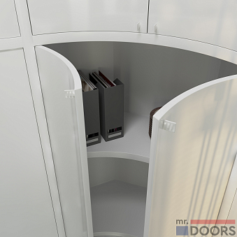 Плавные углы созданы радиусными фасадами. Кроме того, в композиции может быть использован и поворотный фасад, который используется в качестве скрытого бара.