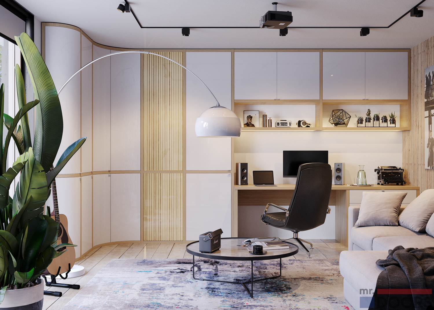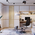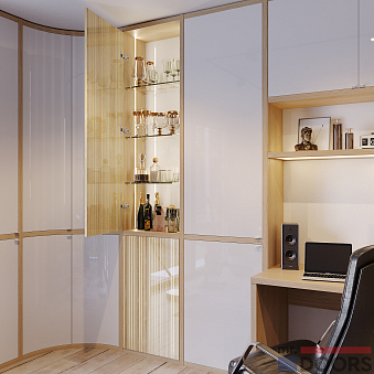 А если их требуется много, то в кабинете обязательно должен быть шкаф. В данной композиции предлагается единое рабочее пространство, которое включает в себя письменный стол, открытые и закрытые полки, радиусный шкаф и даже мини-бар!