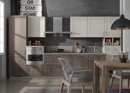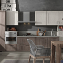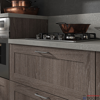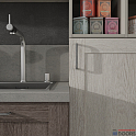 Открытая секция и цоколь изготовлен из плиты «Тауп». Столешница — из керамики Ceralan в декоре «Фавола григио». Ручки «Раккорди» делают композицию завершённой, к тому же, они удобны в использовании.