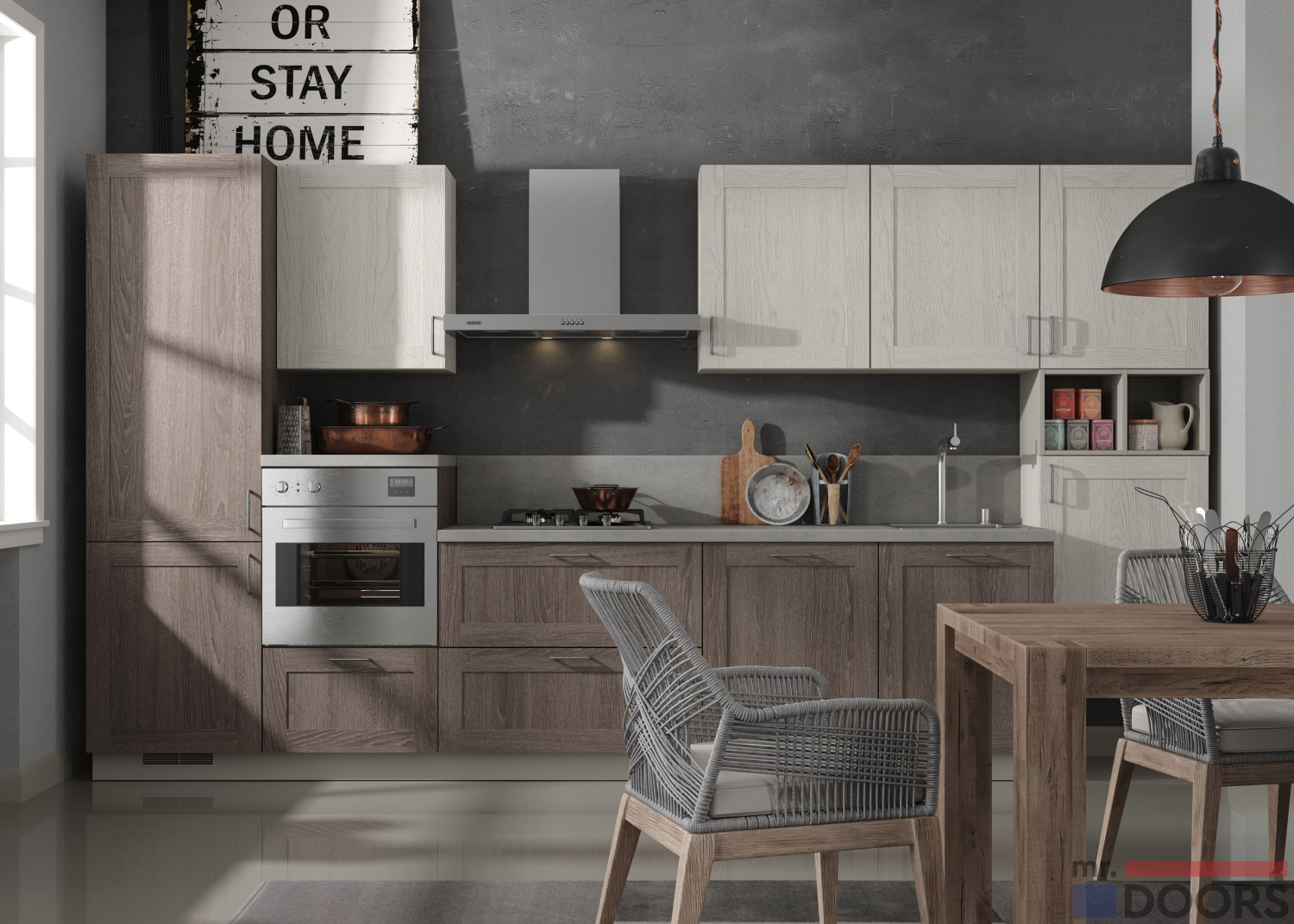 Стильная кухня с фасадами «Фрейм», имитирующими поверхность натурального дерева. Корпус и фасады изготовлены из ламинированной плиты. Для декора нижних баз и модуля для установки встроенного холодильника использован «Дуб Орлеанский коричневый», для верхних баз и подвесных модулей — «Дуб Гладстон белый». Структура древесины воспроизведена максимально достоверно.
