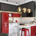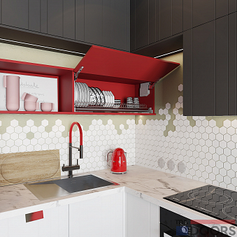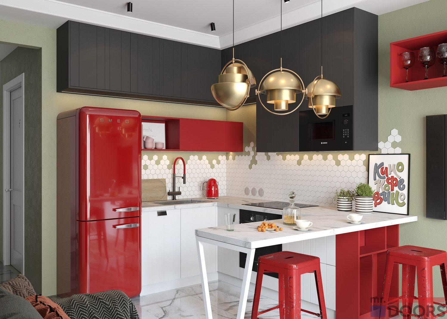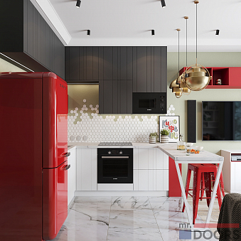 Проект угловой кухни с барной стойкой, служащей разделяющим пространство на зону кухни и гостиной элементом. Гарнитур декорирован с использованием трех цветов. Ярко-красные акценты делают кухню интересной и необычной. Барная стойка может выступать в качестве продолжения рабочей зоны или служить столом. Подвесные шкафы смонтированы в два ряда до потолка, что позволяет максимально задействовать полезную площадь кухни и разместить много вещей.