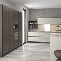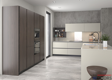 Корпусные и фасадные элементы из ламинированной плиты в декорах «Орех Карини табак» и «Тауп».