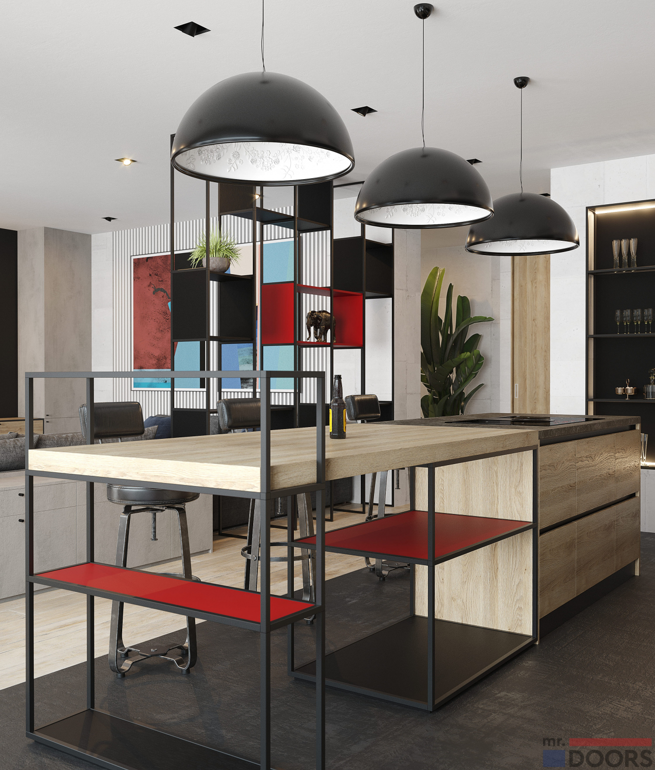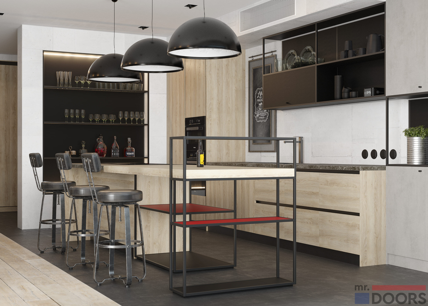 Смотрится очень свежо и создает атмосферу модного кафе или ресторана. Идеально подобрано сочетание металла и отделки FEELWOOD со структурой, имитирующей поверхность натурального дерева.