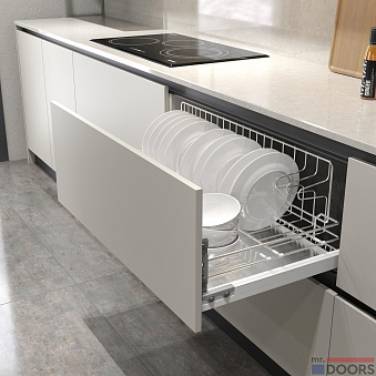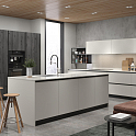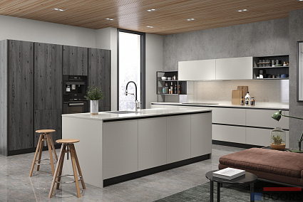 Если у вас просторное помещение, и вы любите готовить, этот проект для вас. Интересное сочетание белого и антрацитового оттенков делает кухню необычной и запоминающейся.
