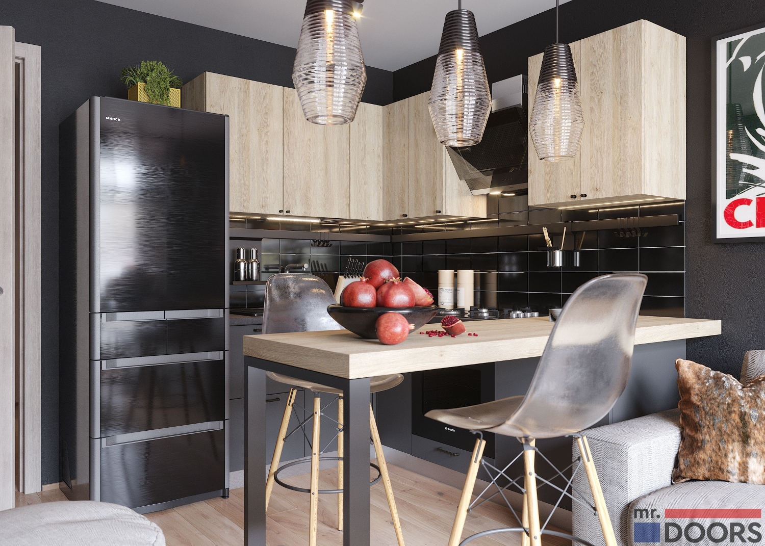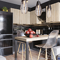 Стильная угловая кухня для квартиры-студии. Предусмотрен остров, изготовленный на металлической опоре. Он может служить барной стойкой или рабочей зоной в зависимости от обстоятельств. Холодильник в проекте отдельно стоящий.