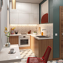 Проект небольшой угловой кухни. Гарнитур выполнен в стилистике предприятий общественного питания 50-х годов 20 века. Кухня занимает совсем немного места, но при этом располагает всем необходимым. Как и во многих других похожих проектах холодильник располагается отдельно от основной композиции.