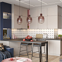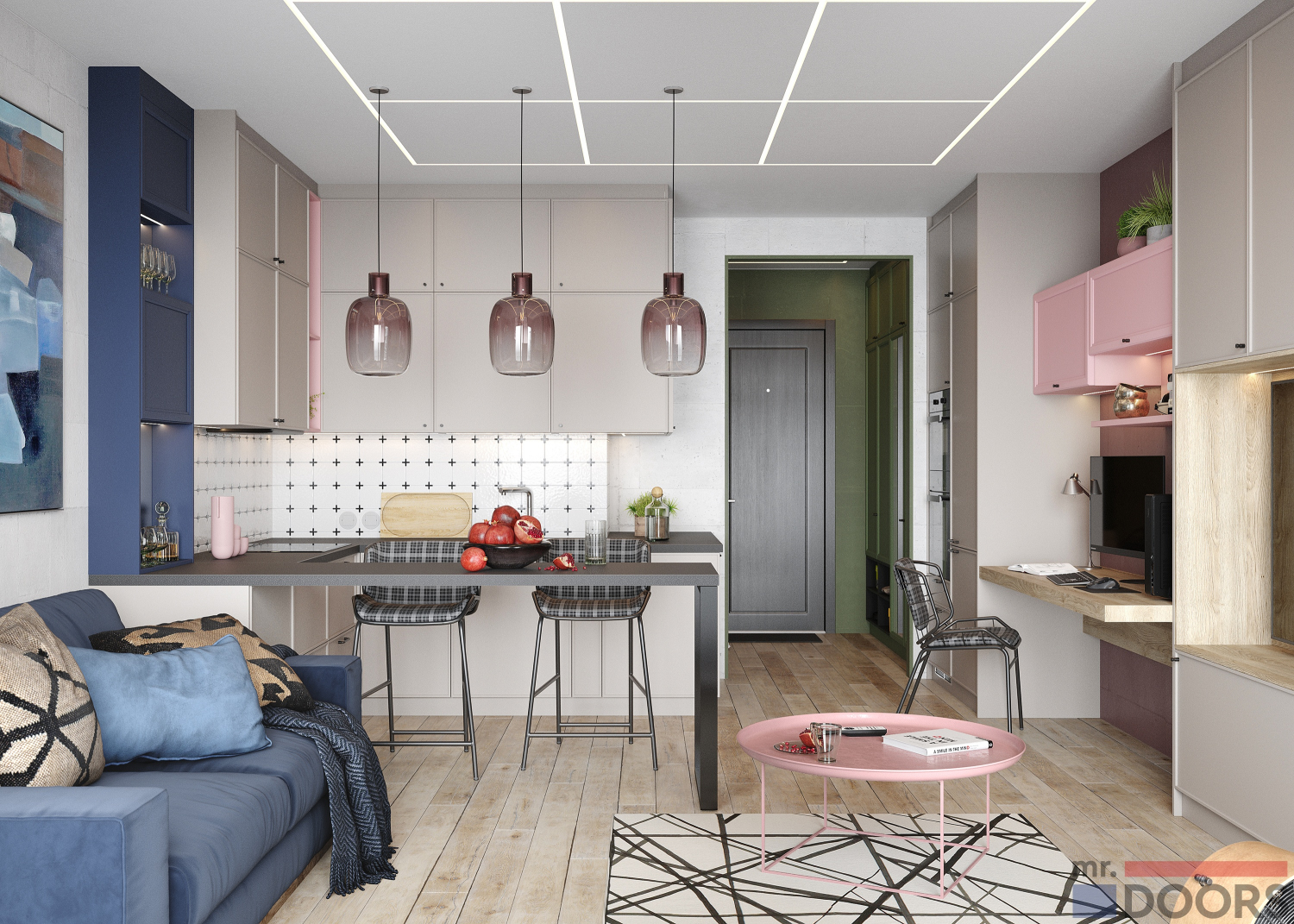 Нежно-розовая кухня с барной стойкой, совмещённая с гостиной, идеально подходит для квартиры-студии, где позволит одновременно использовать минимум площади максимально эффективно и зонировать пространство. Но и для просторной кухни-гостиной в обычной квартире тоже подойдёт.