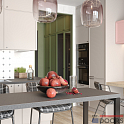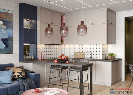 Для создания использованы фасады «Трей» и «Урбан» (для секции у барной стойки«, они отличаются толщиной рамы из МДФ. Фасады «Трей» сделаны в плёнке «Урбан Кашемир», фасады и боковые элементы «Урбан» выкрашены эмалью RAL5001.