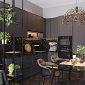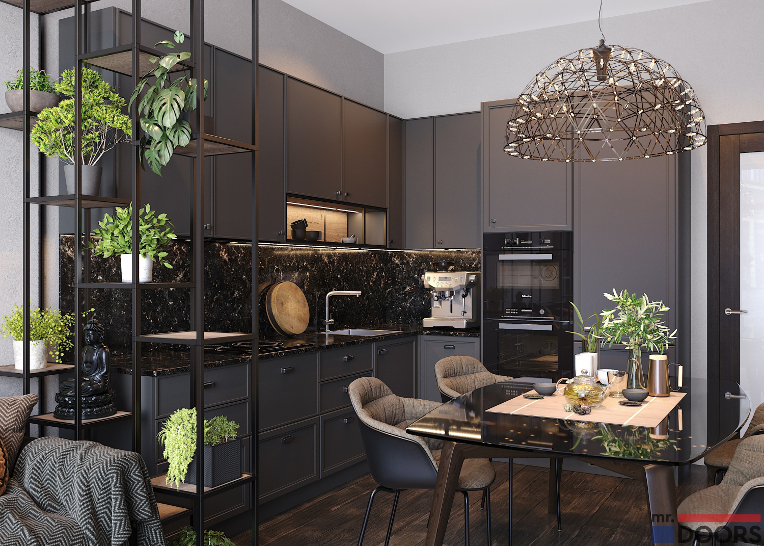 Современная угловая кухня в стиле «Лофт» с открытым металлическим стеллажом. Целиком выполнена в темных тонах, с преобладанием графитового цвета. Стеллаж разделяет кухню и гостиную. Кухонный гарнитур предлагает множество ящиков для хранения посуды и продуктов. Холодильник и другая техника встроены.