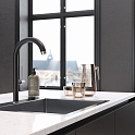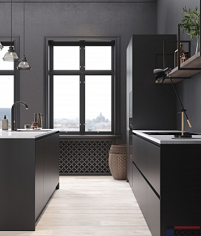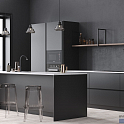 Кухня для тех, кто любит черный цвет. Единственным светлым элементом этого проекта является столешница. Фасады, корпуса, встроенная техника и даже раковина сделаны из черных материалов, рассмотрим их подробнее.