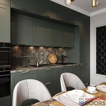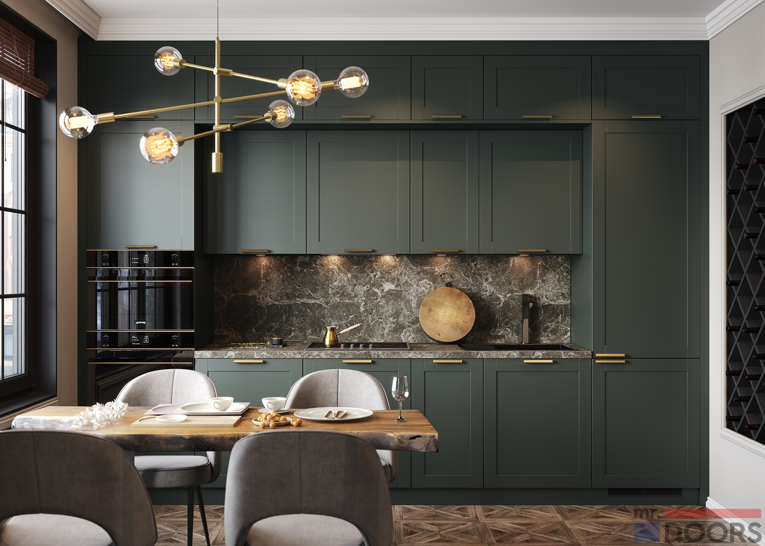 Очень элегантная прямая кухня необычного матового зеленого оттенка. Классическая компоновка проекта: по краям с одной стороны встроенный холодильник, с другой духовой шкаф. Верхняя и нижняя части кухни одинакового цвета.