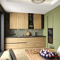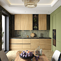 Интересное цветовое решение для угловой кухни. Правая ее часть зеленого оттенка разительно отличается от левой в том числе по компоновке. Отличительная черта кухни в целом является использование в фасадах алюминиевого профиля «Gola», который позволяет отказаться от применения ручек для открывания дверок гарнитура.