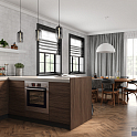 Кухня для загородного дома или квартиры студии. Проект выполнен в угловом исполнении, но в роли короткой части выступает барная стойка с одной стороны и встроенный духовой шкаф с другой. Такое расположение позволяет разделить зону кухни от, например, гостиной.